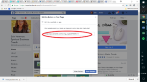 We could debate here whether or not you need a FB biz page…but that’s a subject for another time. For now, let’s assume you have one. The way you create your button  is by right-clicking right the space where that button is below, highlighted with red circle. (Since I already created one, it’s only allowing me to edit/delete/etc., but if you don’t have a button already, it would say “create button”.)